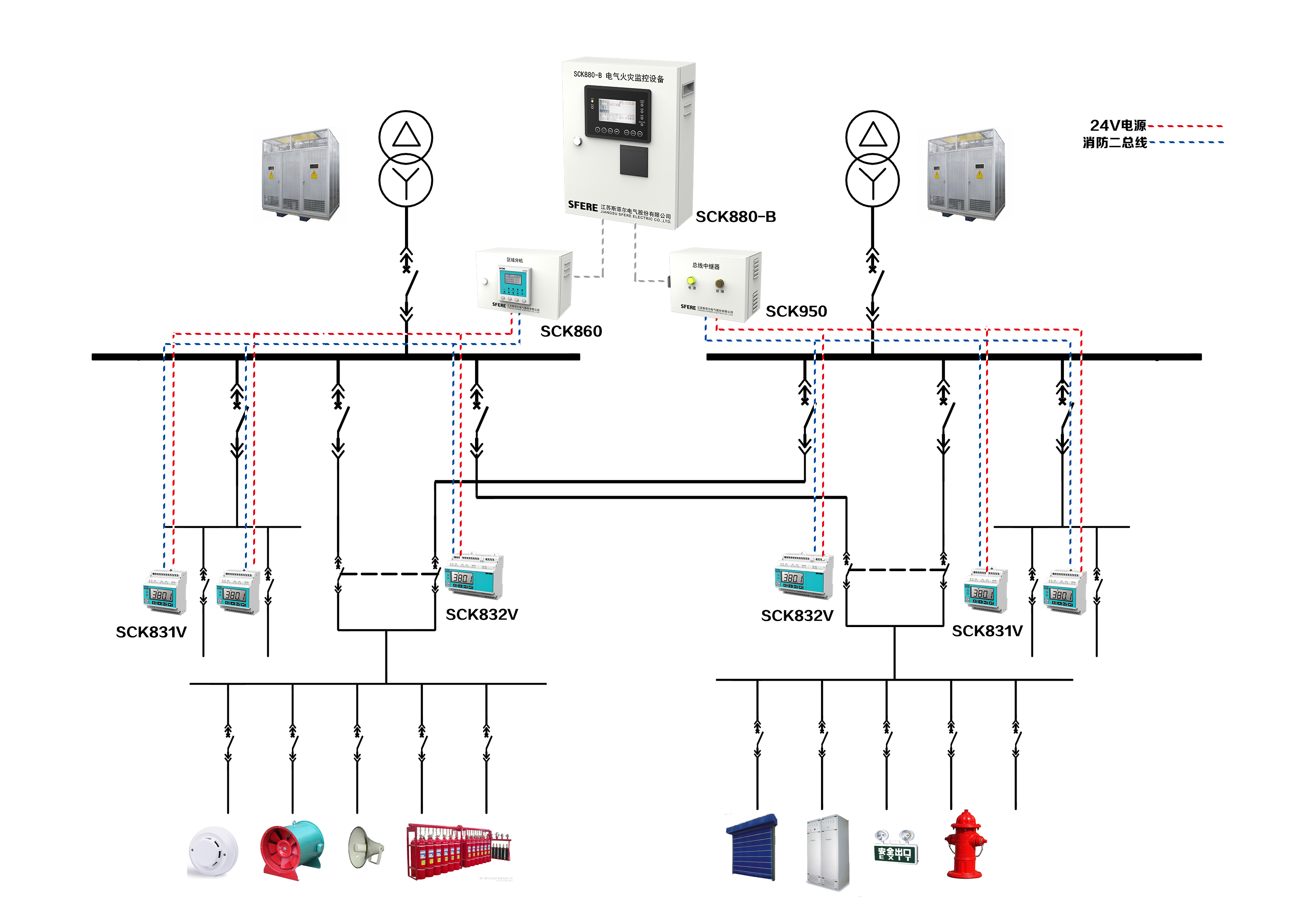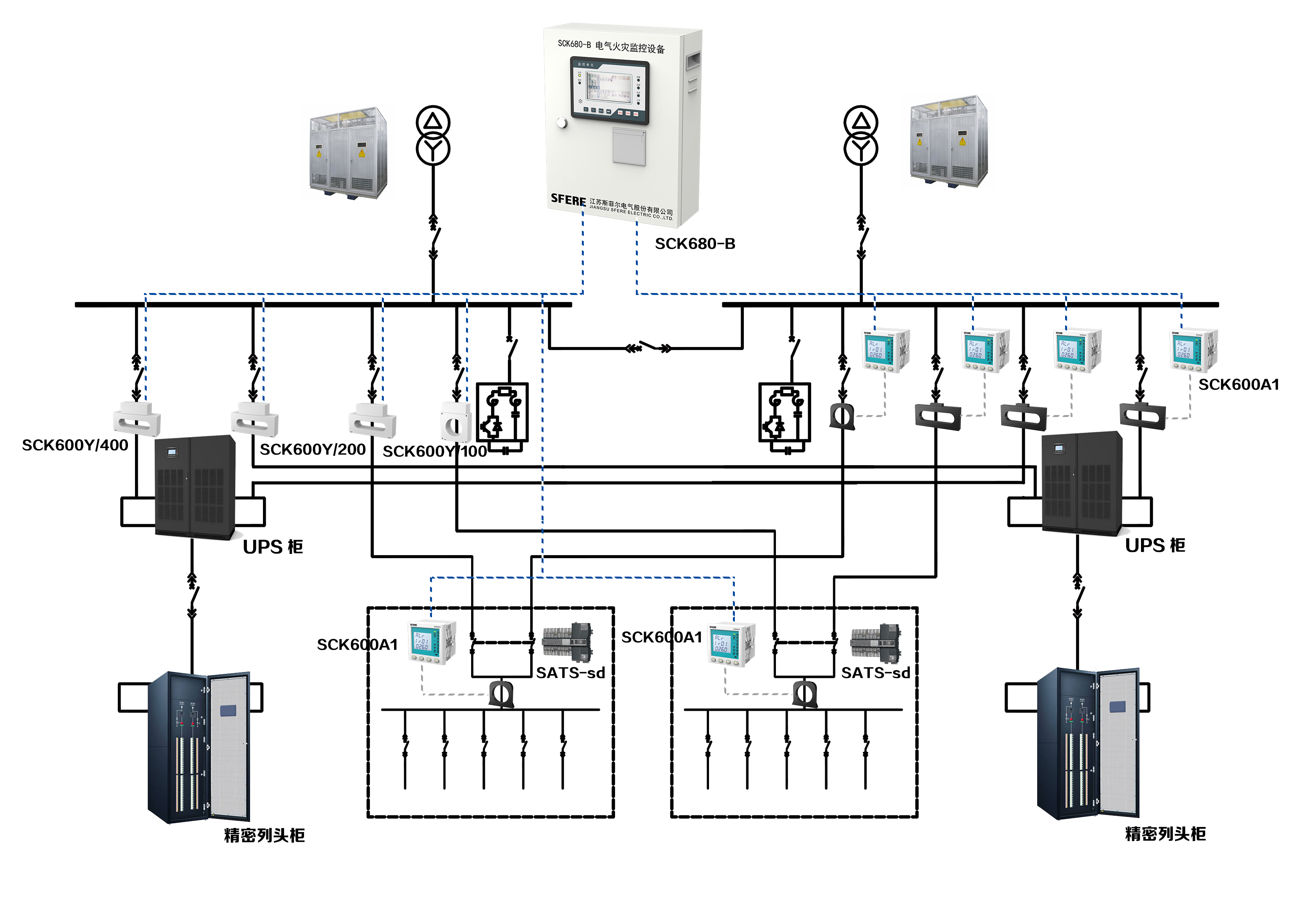 場景及功能描述在數(shù)據(jù)中心內(nèi),SCK600電氣火災(zāi)監(jiān)控系統(tǒng)可安裝于TN-S、TN-C-S以及局部TT低壓配電系統(tǒng)中,系統(tǒng)包含SCK680電氣火災(zāi)監(jiān)控設(shè)備、SCK600電氣火災(zāi)監(jiān)控探測器以及剩余電流互感器、溫度傳感器等附件。電氣火災(zāi)探測器用于監(jiān)測回路中剩余電流、負荷電流、電纜溫度等參數(shù),同時上傳至監(jiān)控設(shè)備實現(xiàn)集中控制和集中管理;當回路中相關(guān)參數(shù)異常時,監(jiān)控設(shè)備發(fā)生聲光報警,指示報警部位,同時現(xiàn)場探測器發(fā)出聲光報警和控制信號,提醒用戶對隱患線路進行排查或者更換,降低由于電氣原因造成火災(zāi)的風(fēng)險。