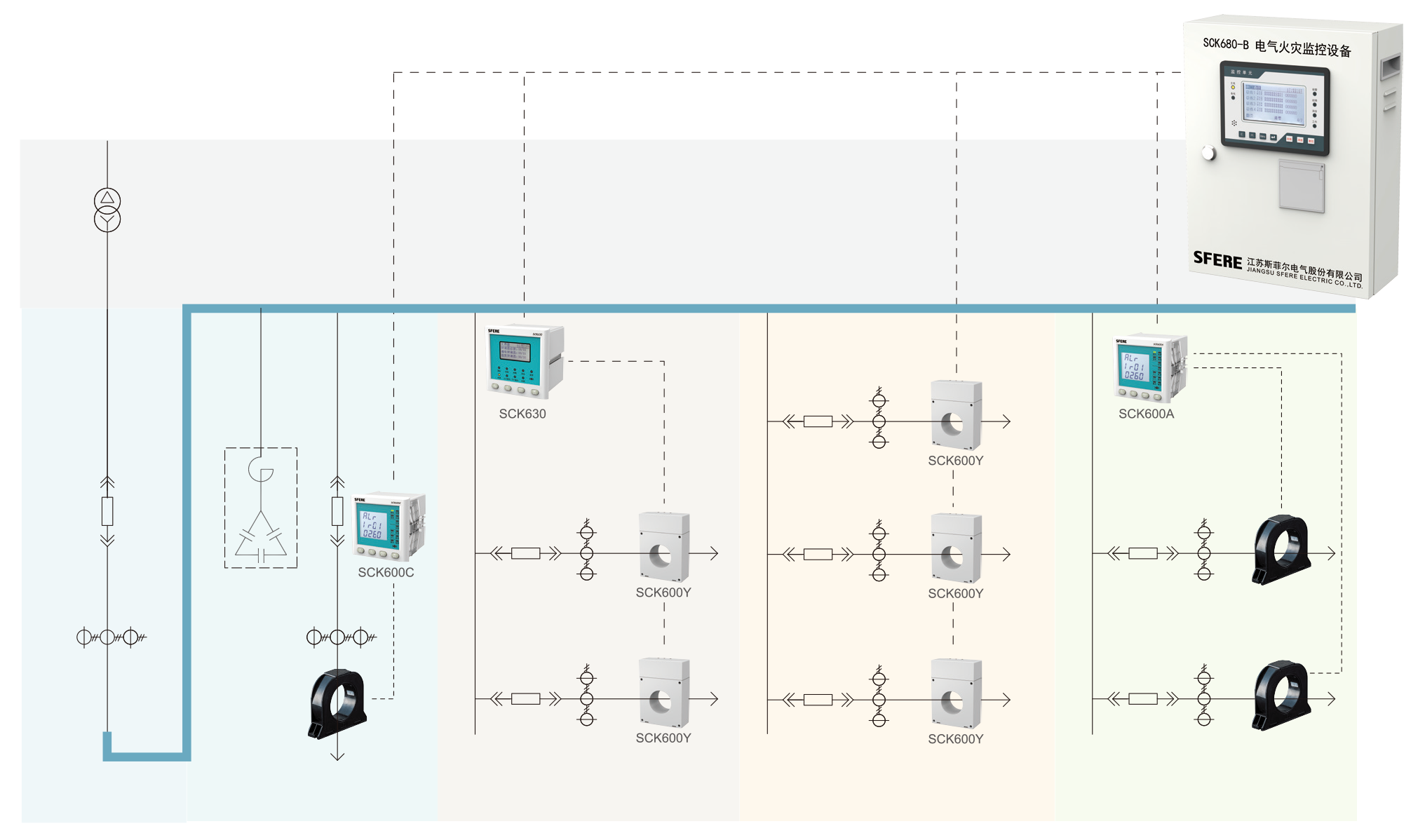 SCK600電氣火災(zāi)監(jiān)控系統(tǒng)采用設(shè)備層、通信層、管理層三層分布式設(shè)計,實現(xiàn)分散控制、集中管理。