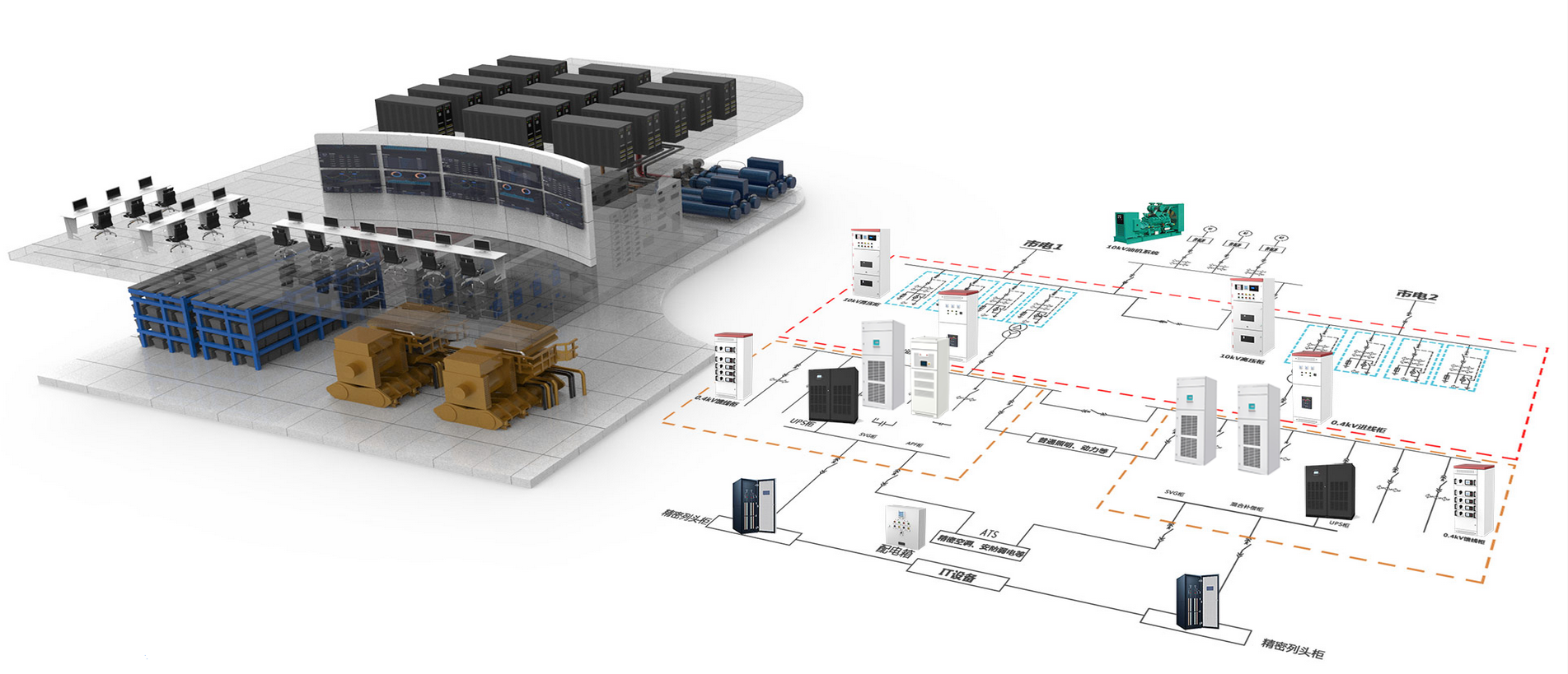 該方案主要針對數據中心的基礎設施配電,動態消諧式無功補償部分進行功率因數提升,有源電力濾波器進行諧波治理,從而使系統的功率因數和諧波都能滿足要求,更好地保障數據中心基礎設備的用電需求。