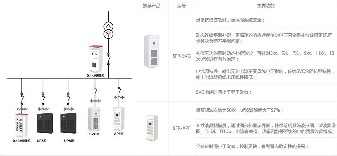 該方案主要針對數據中心的機房配電,由于機房負荷主要由UPS供電,UPS整流過程中容性無功比較大,所以采用靜止無功發生裝置,具備雙向無功補償能力,使系統保持接近為1的單位功率因數,同時可采用有源電力濾波器進行電能質量的改善,綜合解決數據中心的諧波問題,消除諧波對電力系統的危害,避免諧振風險,有效改善數據中心機房用電環境,提升機房用電可靠性。
