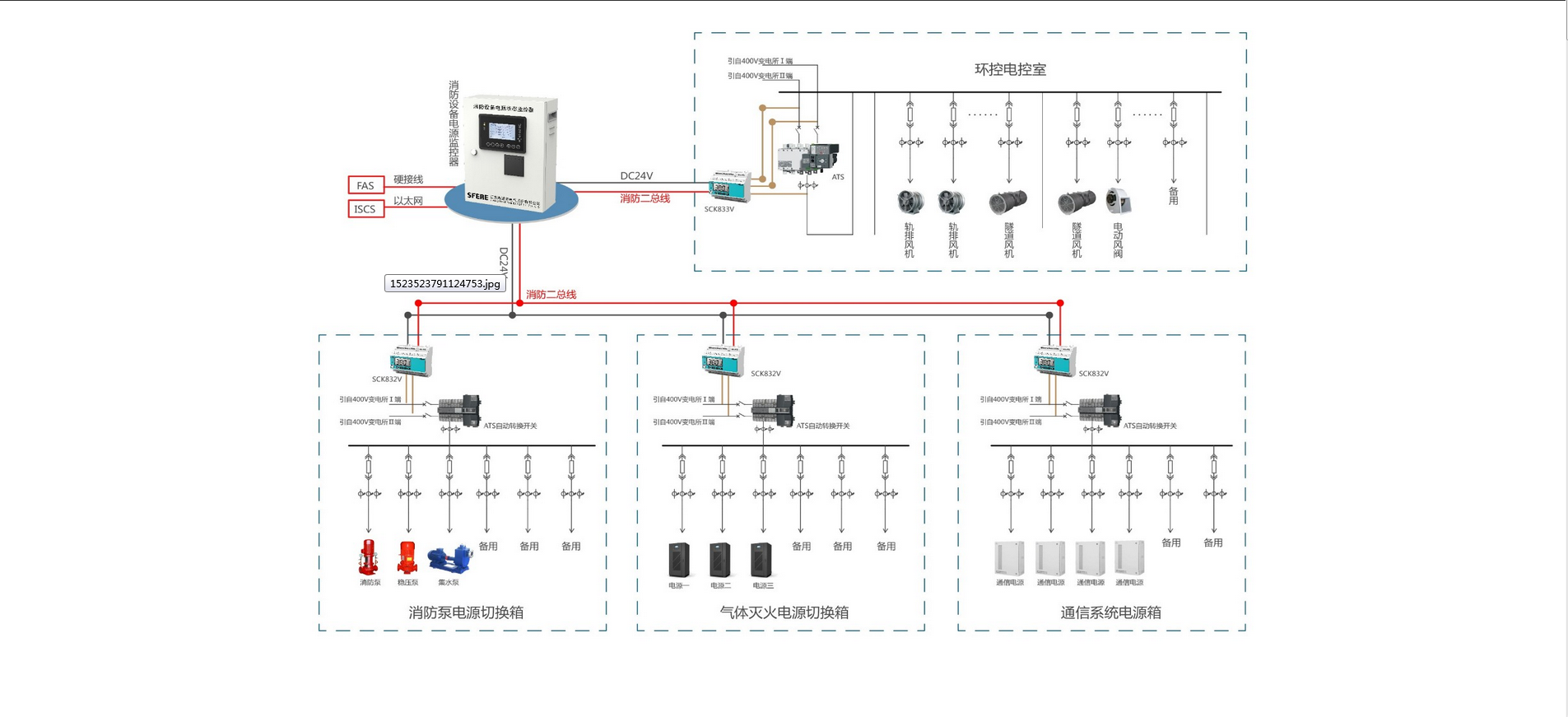 在環控配電室進線柜安裝一只SCK833V電壓傳感器,同時監測ATS進線(主/備)及出線共計3路電壓,柜內傳感器經消防二總線連接至監控主機下行通信口。在消防負荷、通信、信號等重要負荷配電箱內安裝SCK832V電壓信號傳感器,同時監測ATS進線(主/備)電壓,經消防二總線連接至監控主機;傳感器工作所需DC24V電源由監控主機提供,確保傳感器在市電斷電的情況下正常工作。