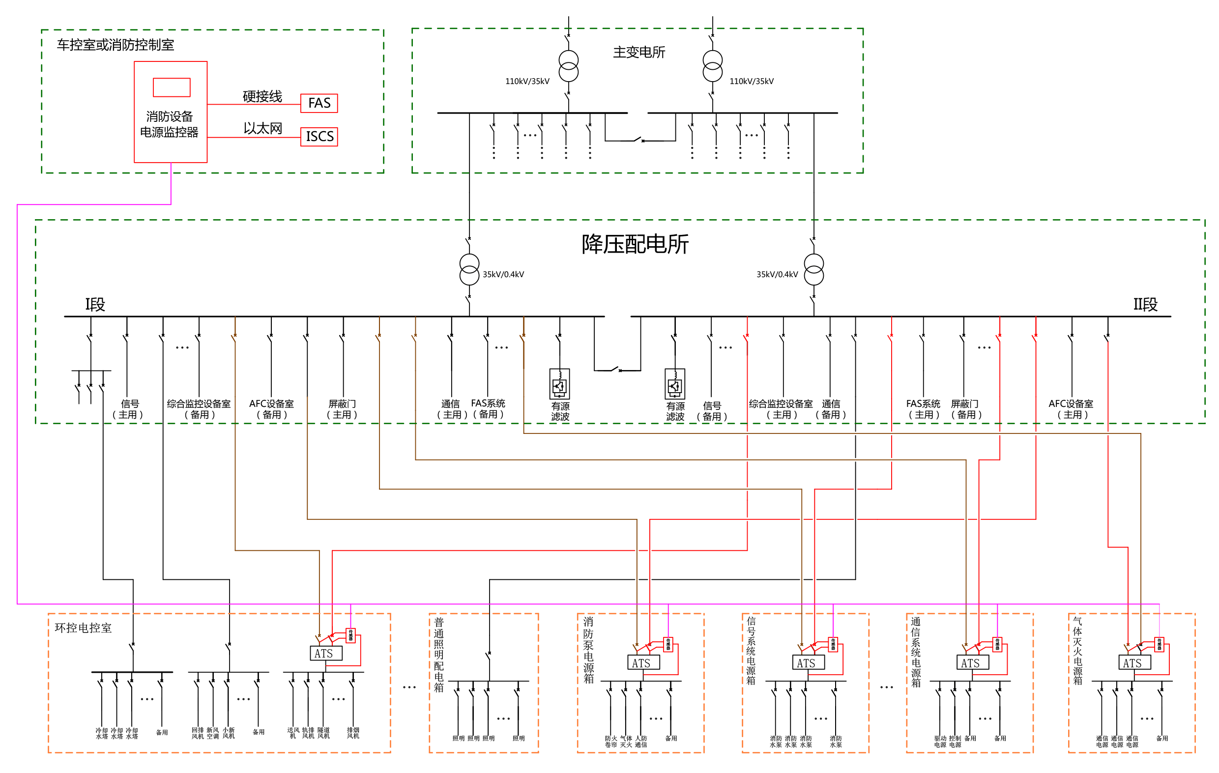 GB25506-2010《消防控制室通用技術要求》作出了“消防控制室應能顯示系統內各消防用電設備的供電電源和備用電源的工作狀態和故障報警信息”的強制性規定,GB50116-2013《火災自動報警系統設計規范》也對消防控制室內要設置消防電源監控器提出了明確要求。因而,通常在地鐵設計和建設時會設置消防設備電源監控系統。