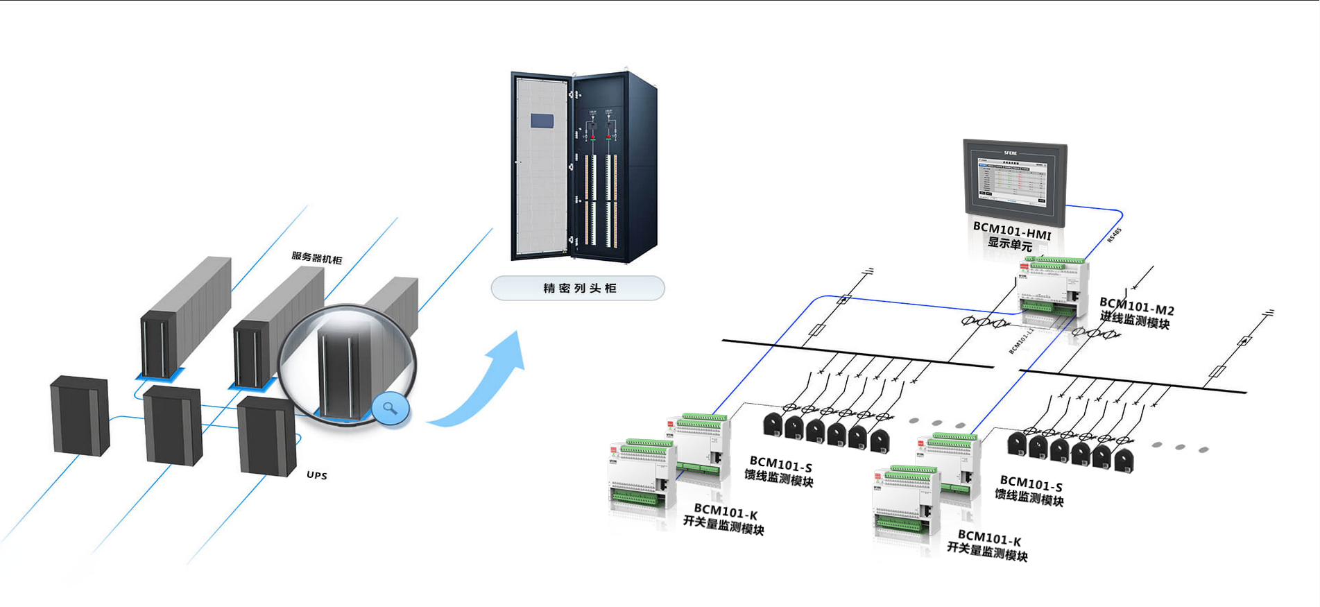 精密列頭柜為數據中心能源末端服務器設備等提供安全可靠的電源,精密配電單元為數據中心能源監測系統提供高精度測量數據,通過人機界面,實時反映電能質量數據。并通過數字通信上傳至后臺動環監控系統,從而實現對整個配電系統的實時監控。同時,精密配電單元提供電能計量功能,可實現配電及機架精細的能效分析,為配電網絡和服務器運行能效優化調節提供依據,從而達到節能降耗的目的。