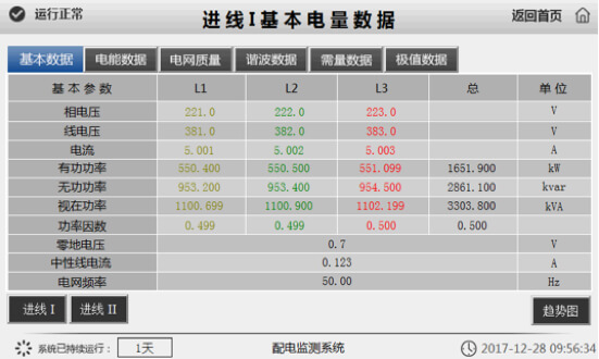 實時監測進、饋線基本數據,包括電壓、電流、功率、功率因數、頻率、電能數據、電網質量、諧波、需量、極值等。