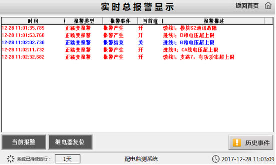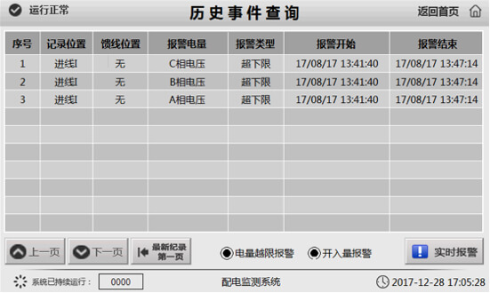 查詢電量越限報警記錄,顯示歷史報警信息,詳細記錄報警電量、報警類型及報警起始時間,通過查詢歷史事件可追溯報警時運行線路的狀態。查詢開入報警記錄,顯示開關量報警信息??稍敿氂涗涴伨€位置、報警電量、開關狀態及動作時間。