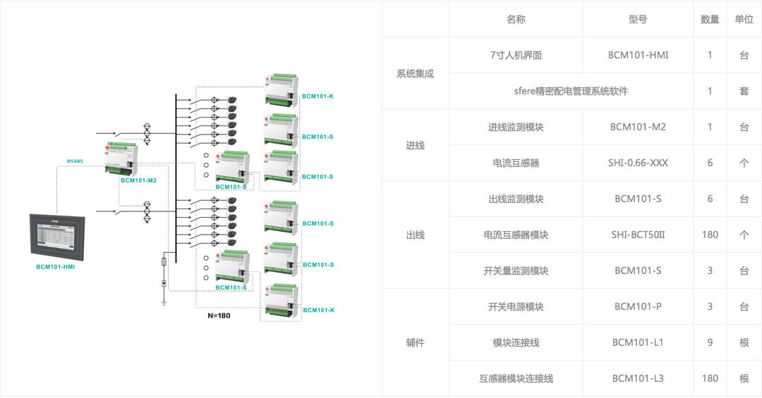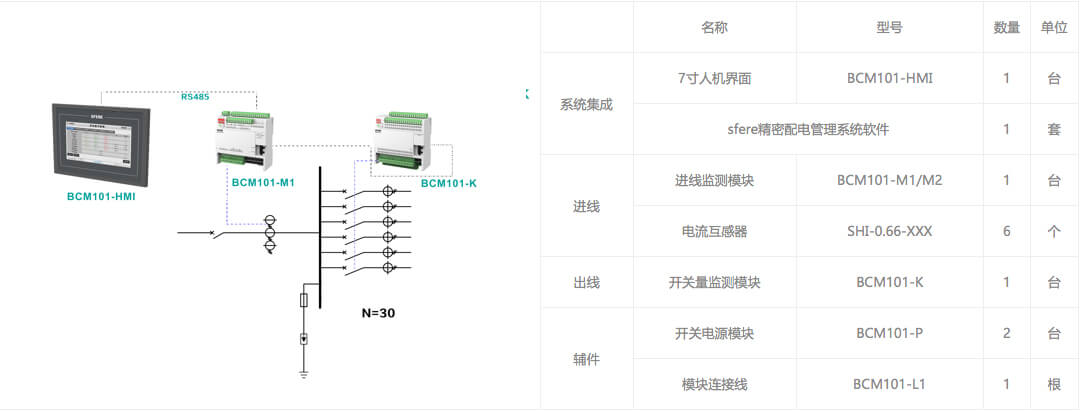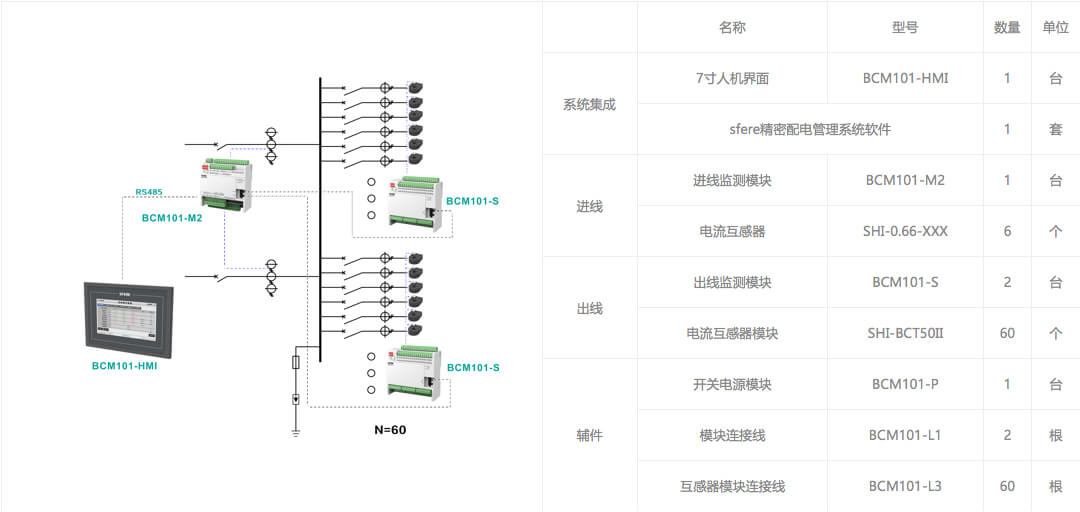進線回路采用BCM101-M1模塊,監測1路三相進線回路,出線回路配置1個BCM101-K開關量監測模塊(最大可監測60個出線回路)。實現對進線電參量基本電量數據、電能數據、電網質量、諧波數據、需量數據、極值數據及出線回路開關狀態監測。